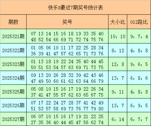 兴奋8第2025327期奖号为:06 07 10 15 16 17 19 21 22 25 27 35 36 40 44 45 47 56 62 74,其中奖号012路比为6:7:7,大小比为6:14。